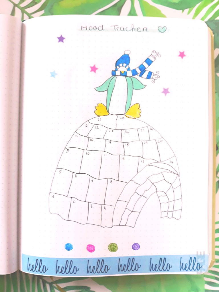 Pour mon mood tracker, je me suis inspirée de Pinterest pour dessiner ce petit pingouin tout emmitouflé assis sur son igloo ! Je trouvais ça parfait pour cette période hivernale. Ainsi, je vais colorier les différentes parties du dessin selon un code couleur, en fonction de la manière dont je me suis sentie durant la journée.
