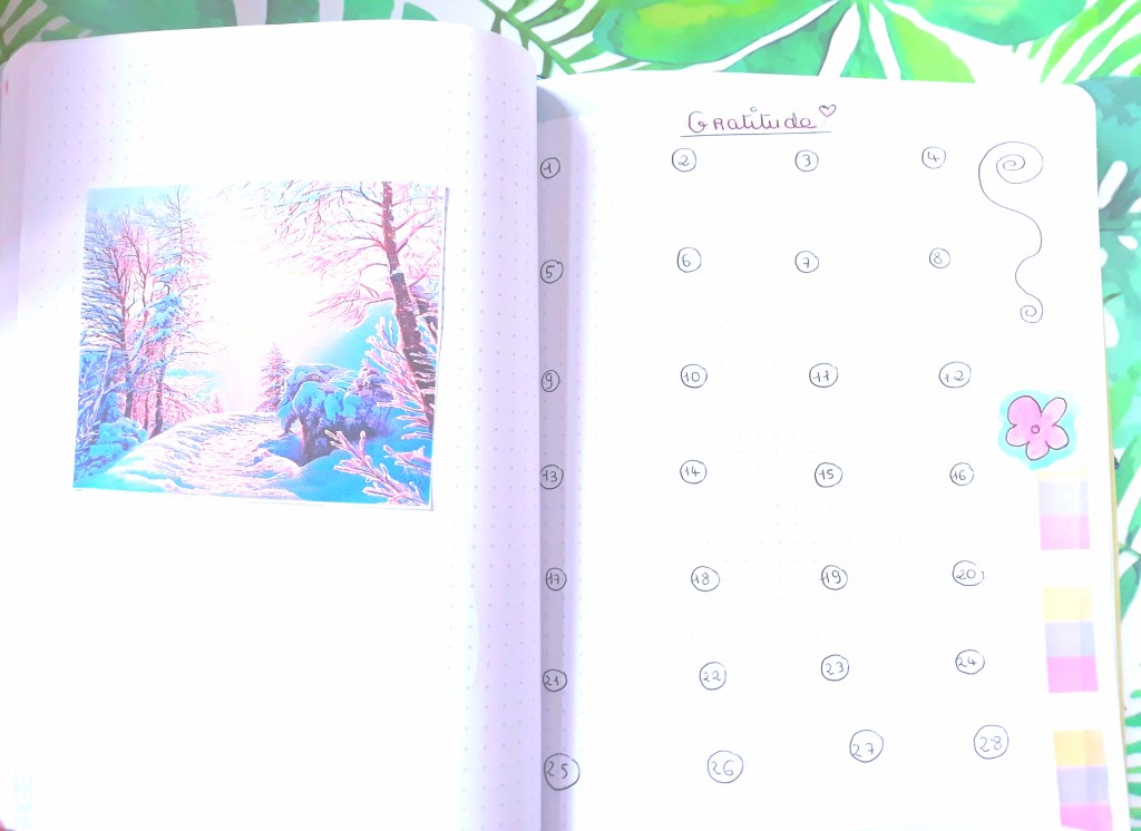 J’aime beaucoup les couleurs pastels de cette page, le rose, violet, bleu… Tous les jours, je note trois éléments pour lesquels je me sens reconnaissante.