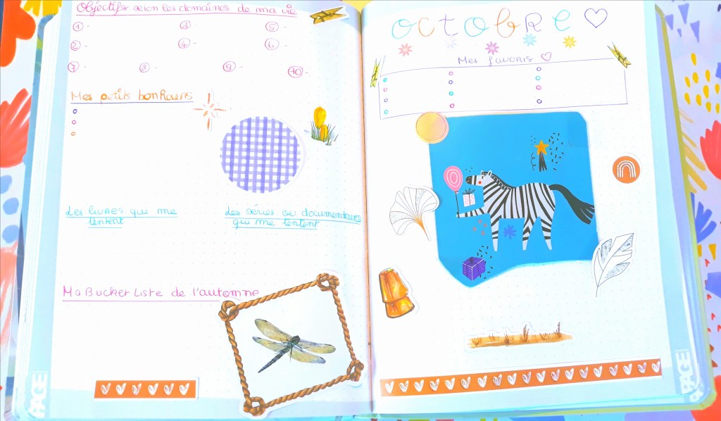 Sur la page de droite, j’ai adoré faire cette petite déco avec des autocollants venant de chez Action, et cette image que j’ai trouvé je ne sais plus trop où… J’ai laissé de la place en haut pour noter mes favoris du mois, dans diverses catégories : livre, série, beauté, nourriture, lieu…