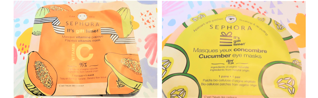 Comme c’était mon anniversaire dernièrement, j’ai pu avoir en cadeau avec mes achats, ces deux masques de la marque Sephora. Un masque à la vitamine papaye qui apporte un joli glow au teint. Un masque pour le contour des yeux au concombre, qui est anti-poches, anticernes, hydratant et lissant.