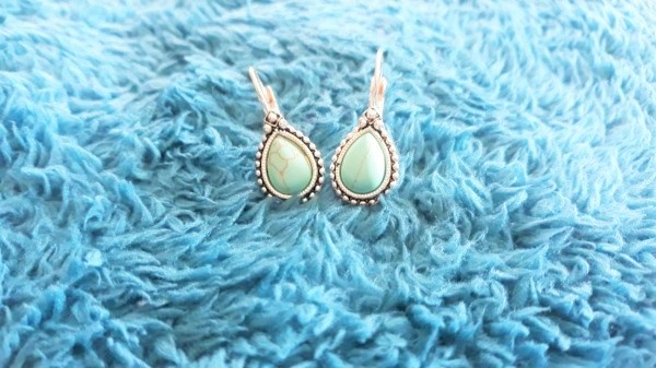 Je possĂšde ces petites boucles d’oreilles depuis longtemps, mais je les ai pas mal portĂ©es ces derniers temps car j’adore cet effet brut de la pierre et la couleur, que je trouve trĂšs adaptĂ©e pour le printemps (on les voit vert sur la photo, mais en rĂ©alitĂ© elles sont plutĂŽt entre le bleu et le vert).