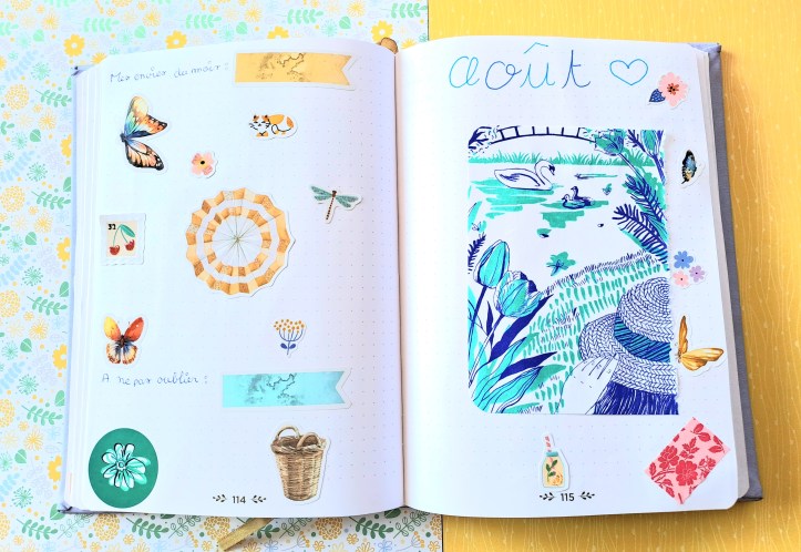 Coucou, cela me fait rire, car sur l’une des pages la couleur majoritaire est le bleu. Serait-ce une référence cachée à la pluie qui a déferlé sur la France durant tout le mois de juillet 😉 ? En tout cas ce sont de belles pages 🙂